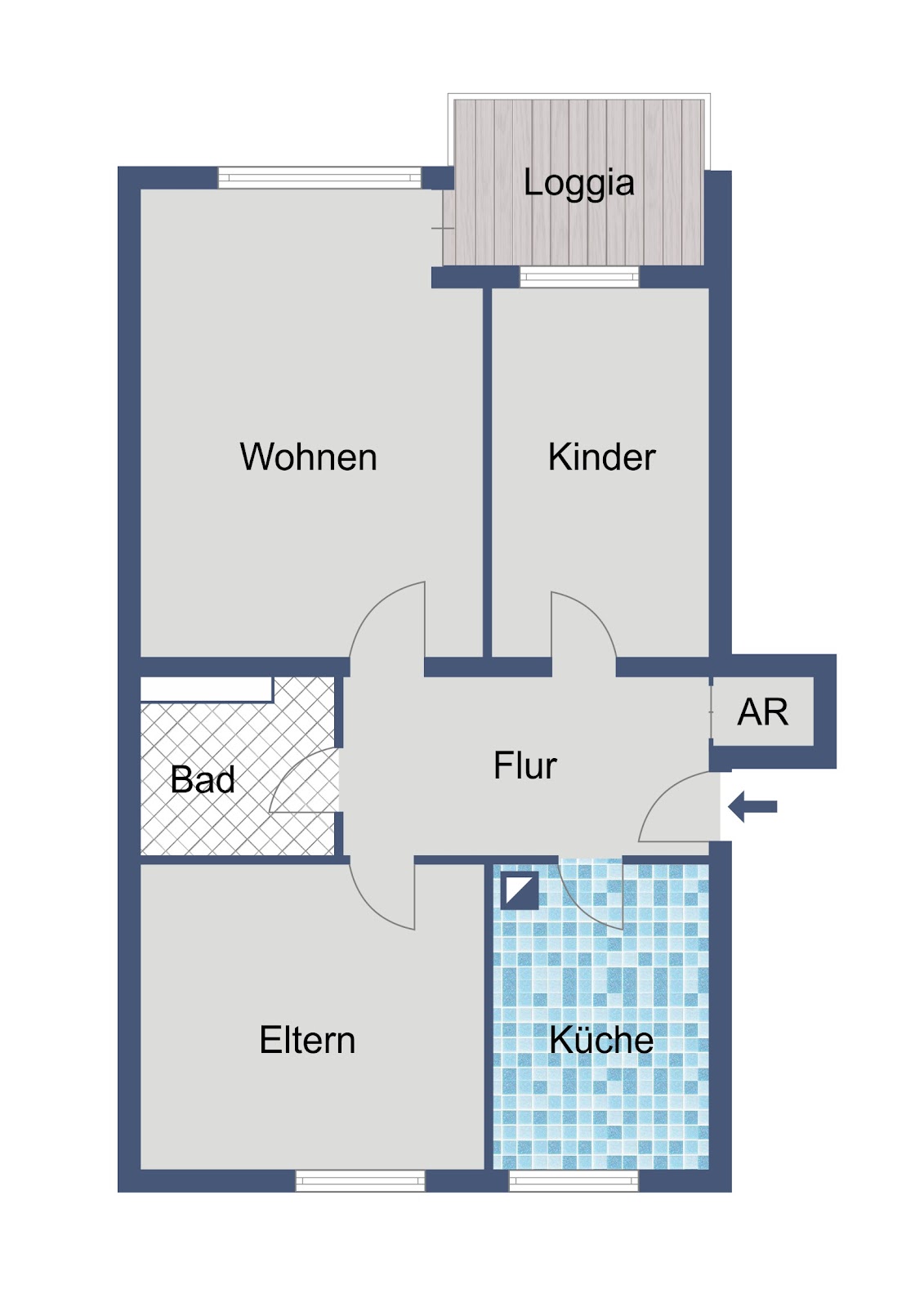 Ein zentraler Flur verbindet die Räume und schafft eine klare, gut nutzbare Raumstruktur. Ein Abstellraum in der Wohnung bietet zusätzlichen Stauraum für Alltagsgegenstände.