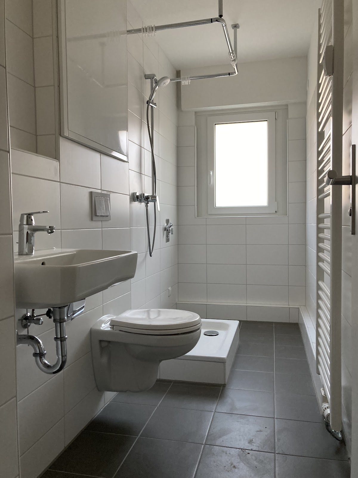 Das Tageslichtbad ist modern gefliest, mit Dusche ausgestattet und wirkt durch weiß gestrichene Wände und Decke freundlich und hell.