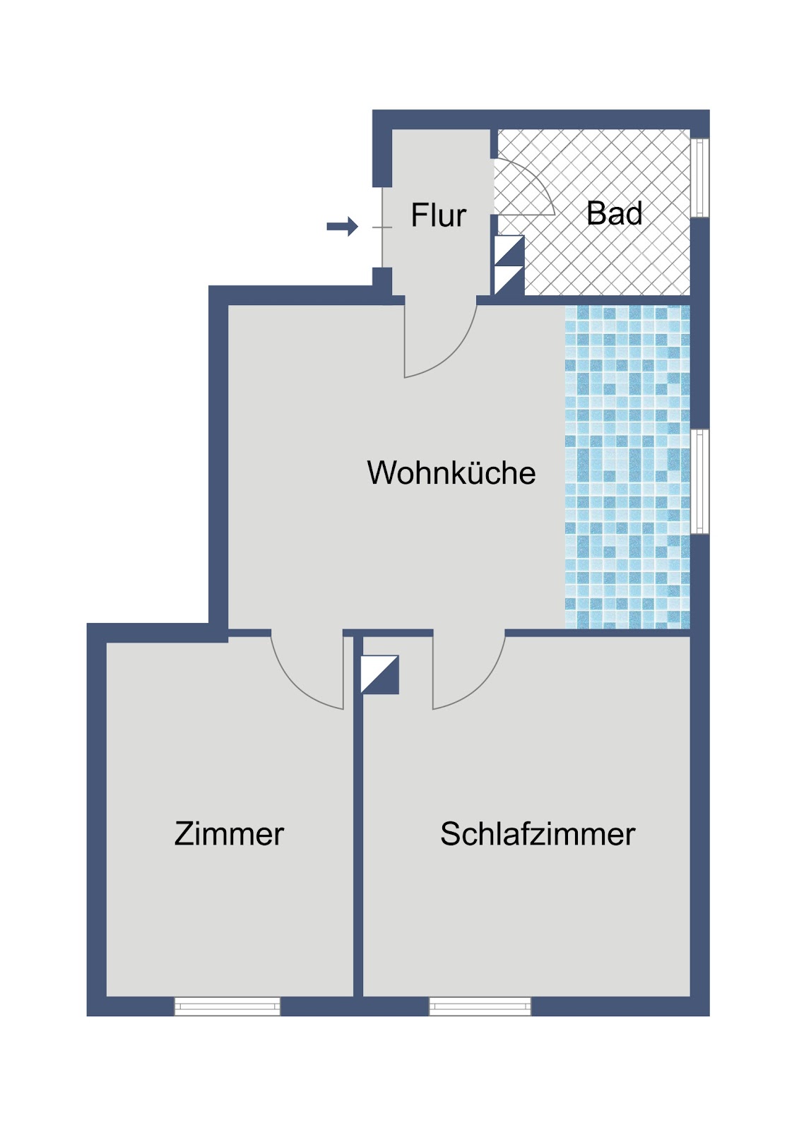 Vom Flur aus gelangen Sie direkt in das Badezimmer sowie in die Wohnküche. Die Wohnküche bildet den zentralen Bereich der Wohnung und bietet Platz für Kochen und Wohnen in einem Raum. Von hier aus erschließen sich das Schlafzimmer als ruhiger Rückzugsort sowie ein weiteres Zimmer, das flexibel als Arbeits-, Gäste- oder Hobbyraum genutzt werden kann. Das Badezimmer ist mit einer Badewanne ausgestattet und vom Flur aus bequem erreichbar. Ein Kellerraum steht als zusätzlicher Stauraum zur Verfügung und bietet Platz für Gegenstände, die nicht täglich benötigt werden.