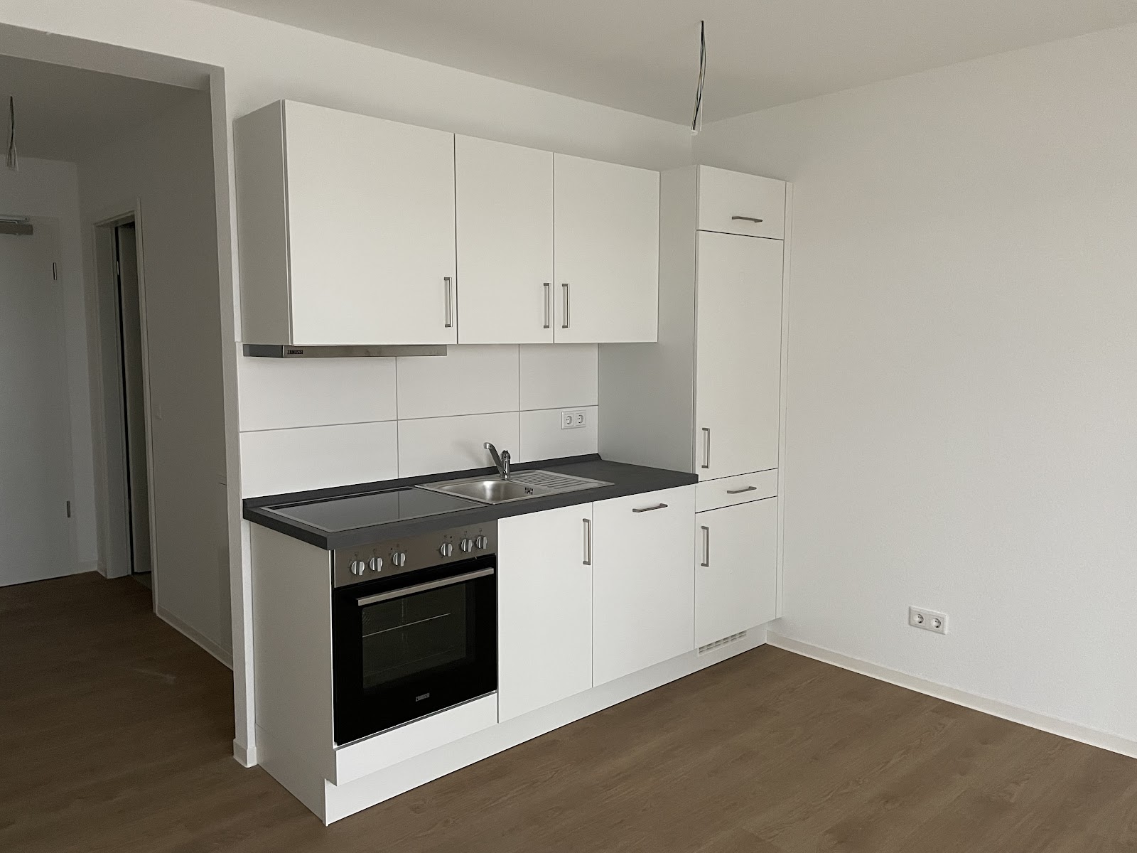 Der helle Wohnbereich ist dank großzügiger Fenster freundlich belichtet und bietet Zugang zum eigenen Balkon – ein geschützter Außenbereich, der den Wohnkomfort spürbar erhöht. Die kleine, integrierte Einbauküche ist funktional ausgestattet und fügt sich dezent in den Raum ein – ideal für den Alltag.